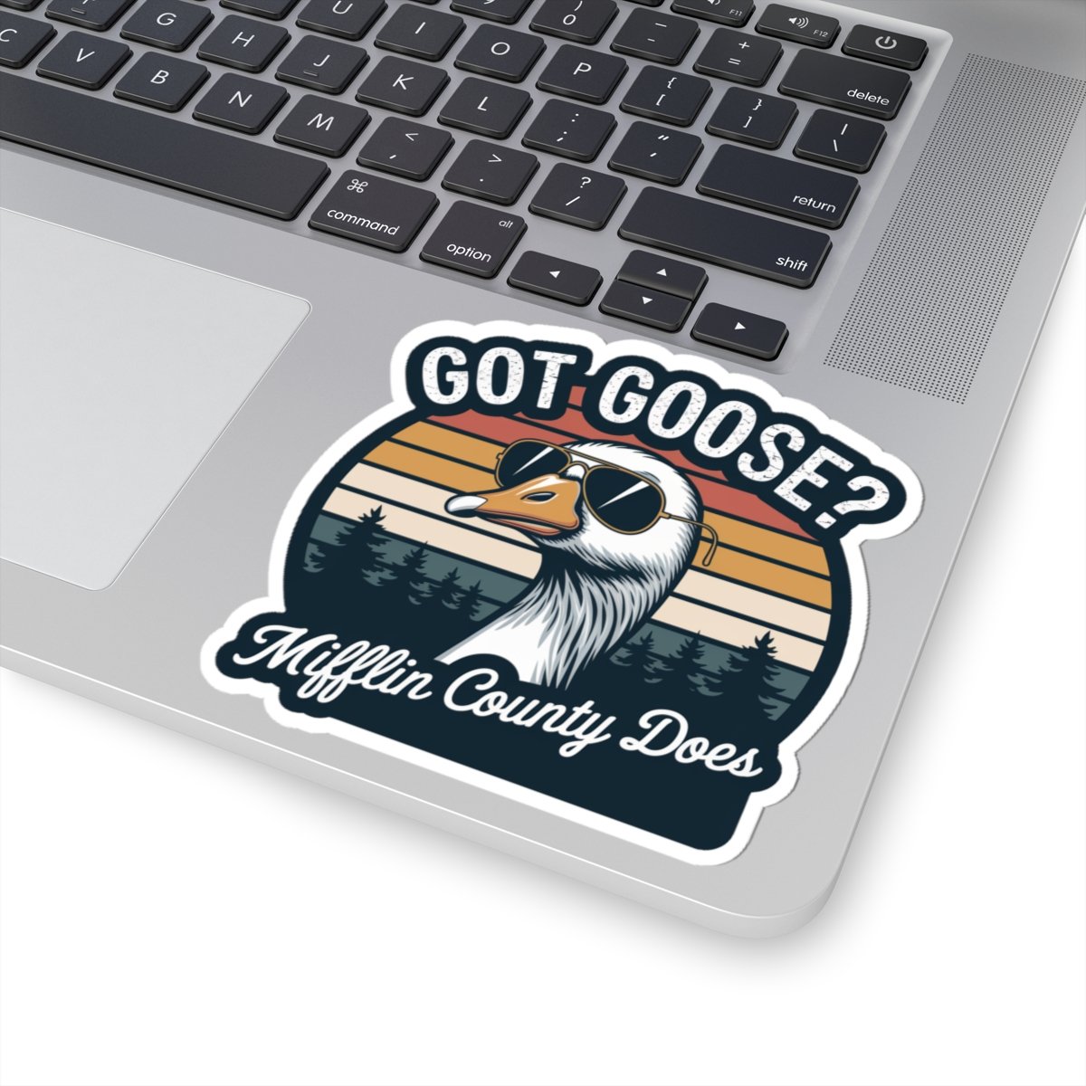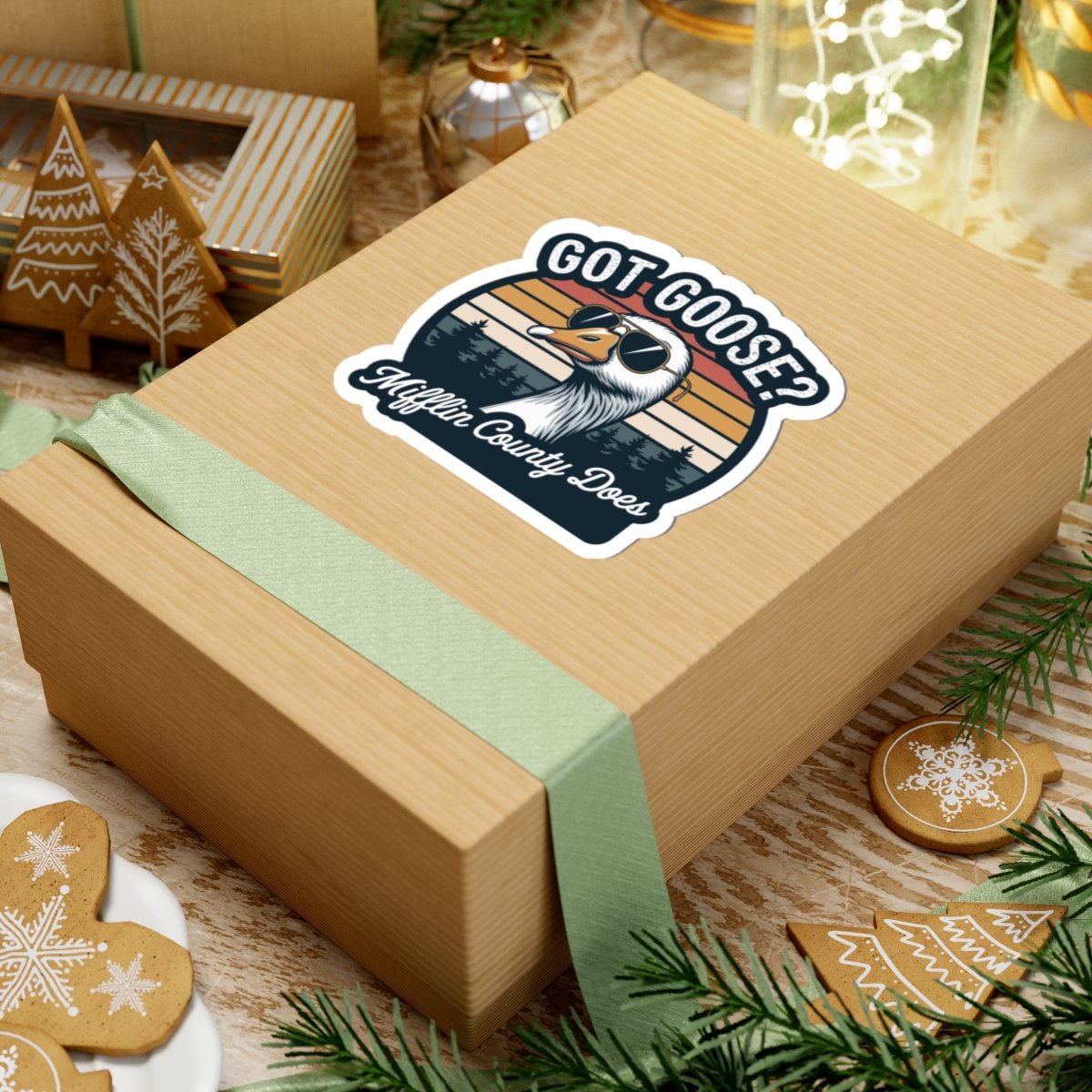Vibrant and durable Kiss-Cut Stickers featuring a unique design inspired by a local celebration in Mifflin County and Juniata River Valley. Perfect for decorating laptops, journals, and windows. Ideal for adults who enjoy adding a pop of color to their indoor decor. Relevant for Goose Day observance and local festivities.