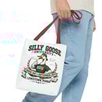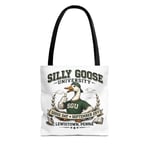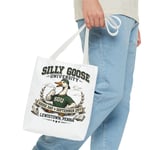 This roomy tote carries a playful, collegiate spirit—Silly Goose University stamped across a bold crest with a thumbs-up goose at its center. The full-color all-over print wraps front and back, turning a practical everyday bag into a conversation starter. Sturdy polyester holds shape and stands up to daily use, while boxed corners and reinforced stitching give real carrying confidence. Choose a handle color that fits your look and pack it with books, market finds, or event swag. The vibe is lighthearted and nostalgic, like a campus mascot come to life—fun for alumni gatherings, campus fairs, or anyone who loves quirky, vintage-inspired designs.